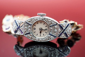 Orologio da polso da donna in oro bianco e giallo, quadrante impreziosito da brillantini e zaffiri incastonati, bracciale a smalti bianco e blu con brillantini centrali, peso lordo gr.17,3, (difetti, mancante uno zaffiro)