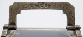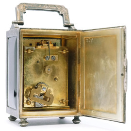 Orologio da tavolo in argento e vetro verde, quadrante a numeri romani, Inghilterra, Wright & Davies, inizi del XX secolo, cm h 8x5,5x4, (meccanismo da revisionare).
