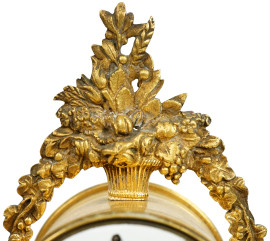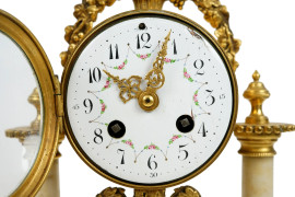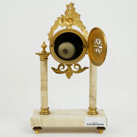 Orologio in bronzo e marmo, Francia, fine XIX-inizi XX secolo, quadrante smaltato a numeri arabi, cm h 38, (privo di pendolo)
