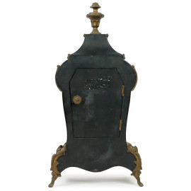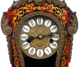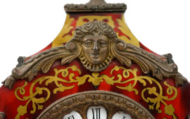 Orologio in stile Boulle, cassa in legno e finta tartaruga con intarsi in metallo dorato, cm h 36x17,5x9, (difetti, meccanismo da revisionare)