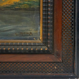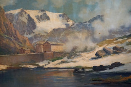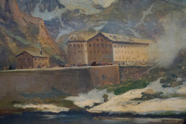 Ospizio del Gran Bernardo, olio su compensato, cm 50x60, firmato, entro cornice.
