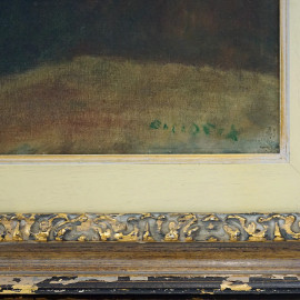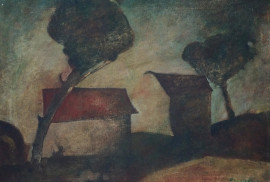 Paesaggio con alberi e case, olio su tela, cm 50x70, firmato, entro cornice