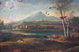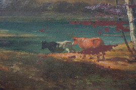 Paesaggio con armento, olio su tavola, cm 20x30, XX secolo, entro cornice.