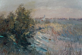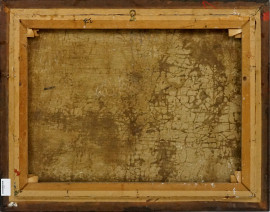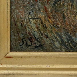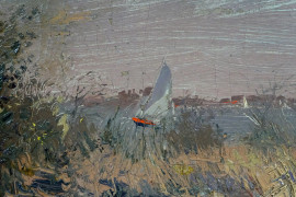 Paesaggio con barche, olio su tela, cm 61x81, siglato, entro cornice.