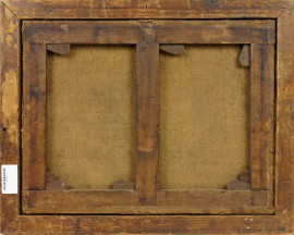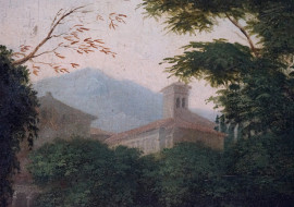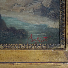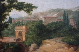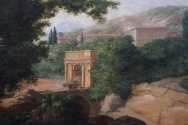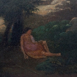 Paesaggio con figure, olio su tela, cm 38,5x51, firmato, entro cornice.