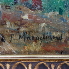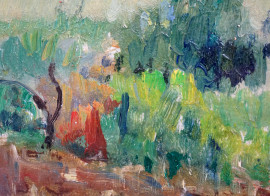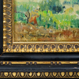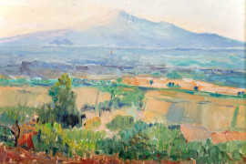 Paesaggio costiero, olio su compensato, cm 22x29,5, firmato, entro cornice.