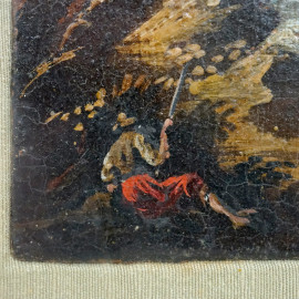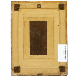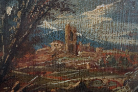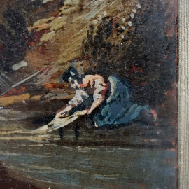 Paesaggio fluviale con rovine e figure, olio su tavola, cm 13,5x10, XIX secolo, entro cornice.