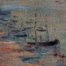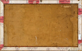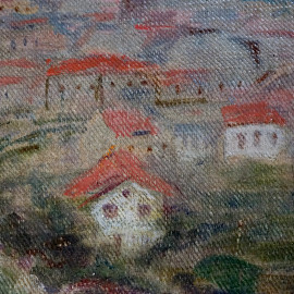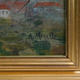 Paesaggio ligure, olio su tela riportata su cartone, cm 45x79, firmato, entro cornice.