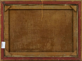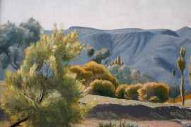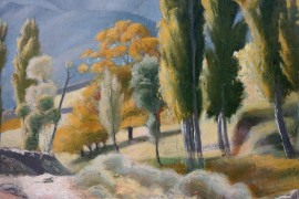 Paesaggio montano con alberi e fiume, olio su tela, cm 47x65, firmato, entro cornice.