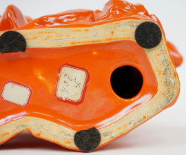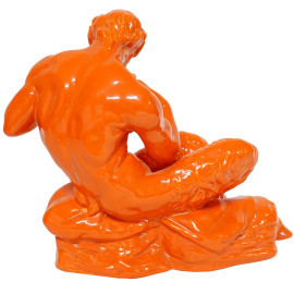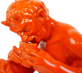Pan, scultura in ceramica smaltata color arancio, cm h 27, XX secolo, (lievi difetti)
