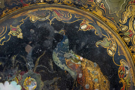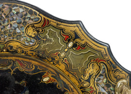 Piatto di linea sagomata in papier-maché, doppia presa laterale, decori policromi e finiture dorate, cm 4x31x24, XIX secolo, (difetti)