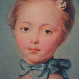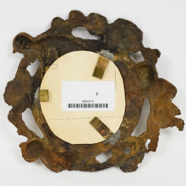 Piccola cornice tonda in metallo dorato, decoro raffigurante putti con festoni floreali, cm 18, (difetti)