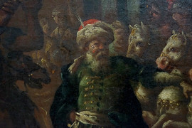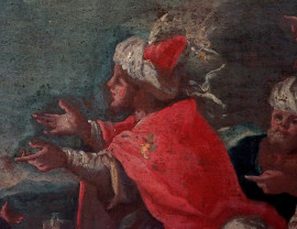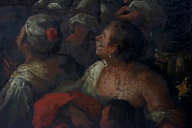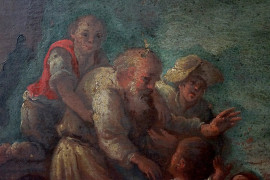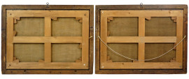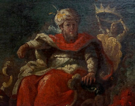 Pittore del XVIII secolo, Coppia di dipinti ad olio su tela raffiguranti Alessandro e Diogene e l'Entrata trionfale di Alessandro il Grande a Babilonia, cm 45x103, entro cornici, (difetti, restauri e cadute di colore)