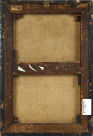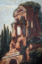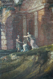 Pittore del XVIII secolo, Paesaggio con rovine architettoniche e figure, olio su tela, cm 48,5x33,5,