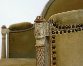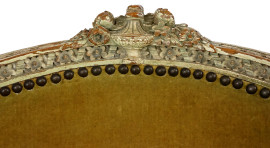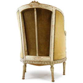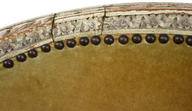 Poltrona a pozzetto in legno scolpito e laccato, inizi XIX secolo, tappezzeria in velluto verde, cm h 102, (difetti ed un restauro)