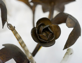 Quattro appliques a due luci in ferro battuto con pendenti in vetro, ornate a motivi fogliacei e rosette, XX secolo, cm h 43 circa, (difetti)