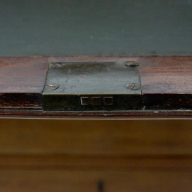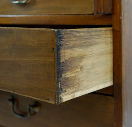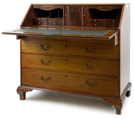 Ribalta lastronata, fine XIX-inizi XX secolo, sportello a calatoia celante cassettini e vuoti all'interno, fronte a cinque cassetti, piedi a mensola, cm h 110x109x55, (difetti).