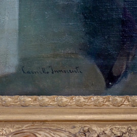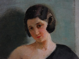 Ritratto di donna, olio su tela riportata su legno, cm 60x41,5, firmato, entro cornice.