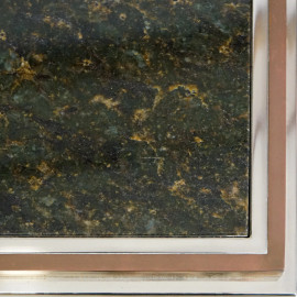 Consolle in metallo cromato con piano in marmo verde incassato, anni '70, ingombro cm 76x161x50.
