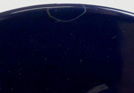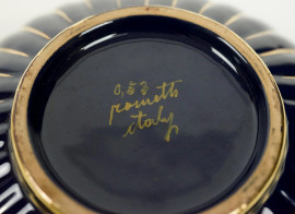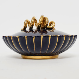 Rometti, portagioie in ceramica a smalto blu cobalto con presa a ricciolo e lumeggiature dorate, cm h 11x17 circa, XX secolo, (difetti)