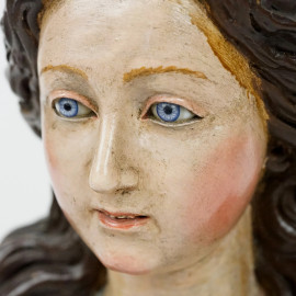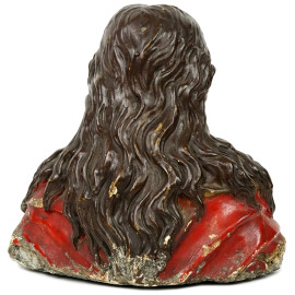 Santa, busto ad altorilievo in cartapesta e stucco dipinto con occhi in vetro, fine XIX secolo, cm h 30, (difetti)