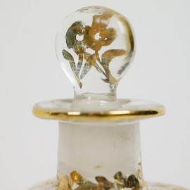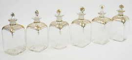 Scatola porta liquori contenente sei bottiglie in vetro trasparente e lumeggiature dorate, ingombro tot cm 21x26,5x18,5 , XIX secolo, (segni del tempo).