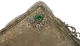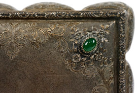 Scatola portagioie in argento con pietre verdi cabochon, decori incisi e cesellati, manifattura italiana, prima metà del XX secolo, cm 8x22x22, peso lordo gr. 1600 circa, (difetti)
