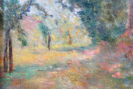 Scorcio di bosco, olio su tavola, cm 24,5x32,5, firmato, entro cornice.