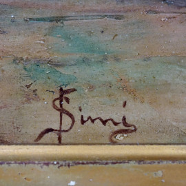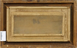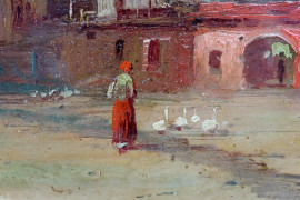 Scorcio di paese con contadina, olio su tavola, cm 13x29,5, firmato, entro cornice.