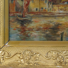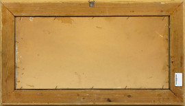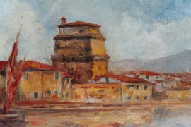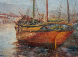Scorcio di porto con imbarcazioni, olio su cartone, cm 32x68, firmato, entro cornice.