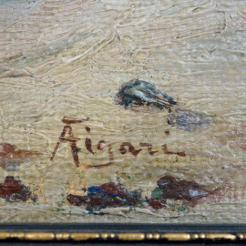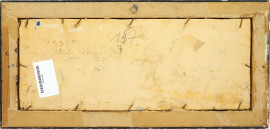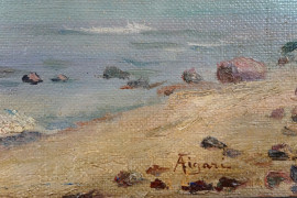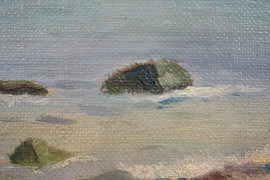 Scorcio di spiaggia, olio su tela riportata su cartone, cm 15x37, firmato, entro cornice