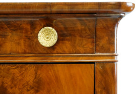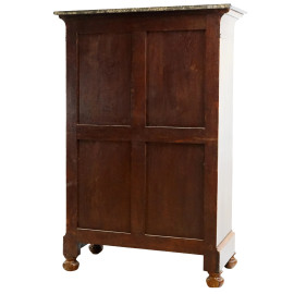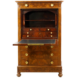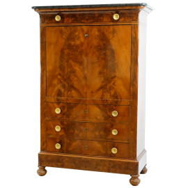 Secrétaire in piuma di mogano, fine XIX-inizi XX secolo, piano in marmo, un cassetto nella fascia, fronte ad uno sportello a calatoia celante sette cassettini all'interno, parte inferiore a tre cassetti, piedi a trottola,cm h 146x97x46, (lievi difetti)