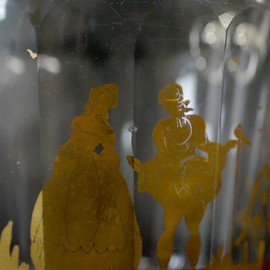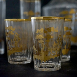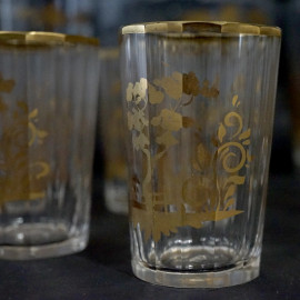 Servizio di bicchieri in vetro con decori dorati raffiguranti paesaggi con dame e gentiluomini, XX secolo, (difetti, servizio incompleto)