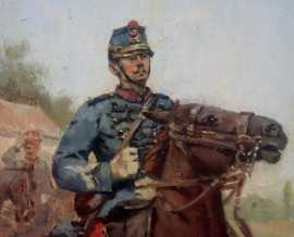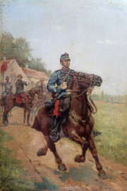 Soldato a cavallo, olio su tavola, cm 22x158,5, firma illegibile, entro cornice