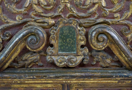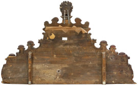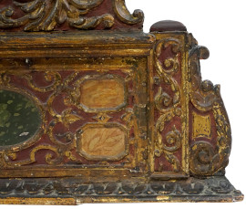 Spalliera, Toscana, XVIII secolo, in legno scolpito, dorato e laccato, decori di girali d'acanto e racemi a rilievo, inserti dipinti a finto marmo, cm 98x158x9, (difetti, restauri)