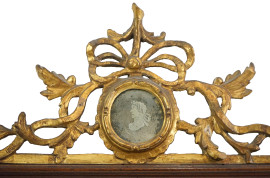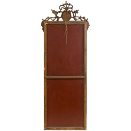 Specchiera di linea rettangolare, XVIII-XIX secolo, cimasa dorata e scolpita a foggia di fiocco centrato da ovale con specchio a mercurio raffigurante profilo maschile, cm h 147x54, (difetti)