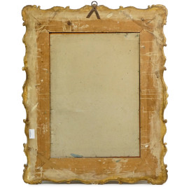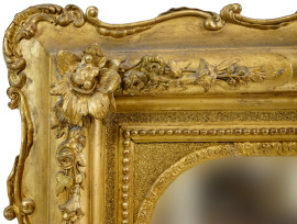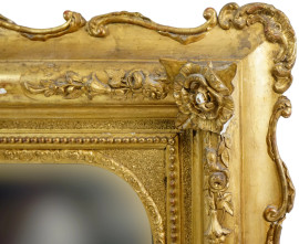 Specchiera di linea sagomata in legno intagliato e dorato, Francia, fine XIX-inizi XX secolo, particolari intagliati a rilievo agli angoli, misure ingombro cm h 110x85,5, (difetti)