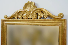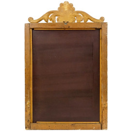 Specchiera in legno dorato con cimasa intagliata a volute, XIX secolo, ingombro cm h 92x59, (difetti)