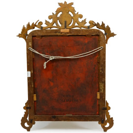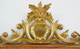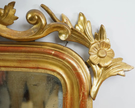 Specchiera in legno intagliato e dorato, XIX secolo, cimasa con decoro a cartiglio e volute, cm h 125x80 circa, (difetti, piedini ed elementi decorativi da fissare)