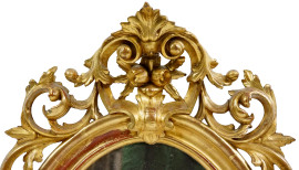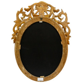 Specchiera ovale in legno intagliato e dorato, XIX secolo, cimasa traforta a volute, cm h 83x59,5, (difetti)