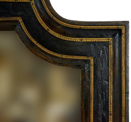 Specchiera sagomata in legno ebanizzato, Francia, XIX secolo, profili in metallo dorato, ingombro cm 154,5x102, (difetti)