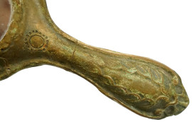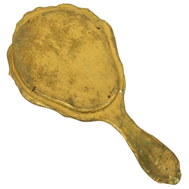 Specchio a mano in legno dorato con decori incisi, cm 30x15, (difetti)