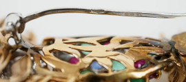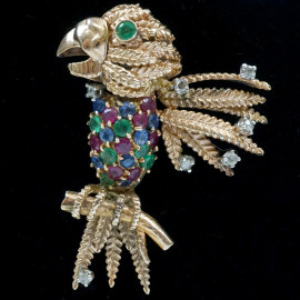 Spilla a forma di pappagallo in oro 14 kt con diamanti, rubini, smeraldi e zaffiri, cm 7x4,5, peso gr. 29,6