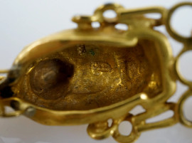 Spilla in stile archeologico messicano, in metallo dorato, cm 9x4,5, (segni del tempo)