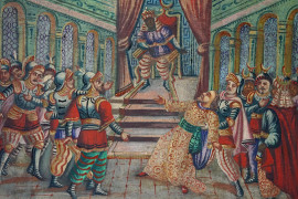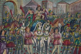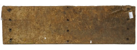 Sponda di carretto, Sicilia, XIX secolo, in legno scolpito, intagliato e dipinto a mano su due sezioni raffiguranti l'"Entrata di Carlo a Parigi" e "Consiglio d'Agramanti", grottesche, mascheroni e motivi floreali a rilievo sulla cornice, cm 35,5x123, fine XIX secolo, (difetti)