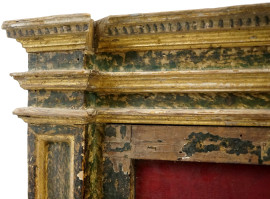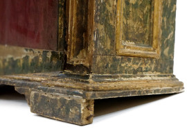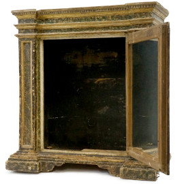 Tabernacolo in legno dorato e laccato, XIX secolo, cappello modanato aggettante con finta dentellatura dipinta, fronte ad uno sportellino, cm 64x60x26,5, (difetti, mancanze)