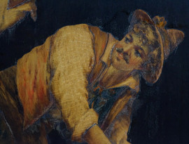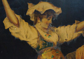 Tarantella, tarsia policroma realizzata in legni diversi, cm 43x26, XIX secolo, entro cornice.