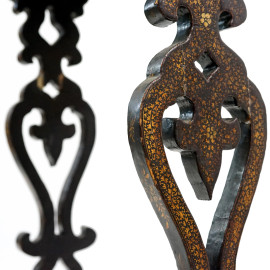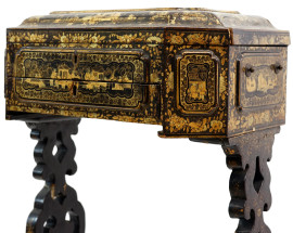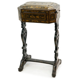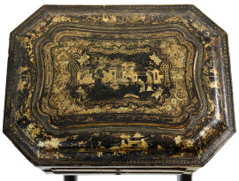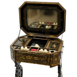 Tavolino da lavoro/cucito in legno ebanizzato e dipinto a cineserie, seconda metà del XIX secolo, completo di specchiera e accessori dell'epoca, cm 77x40x30, (difetti)