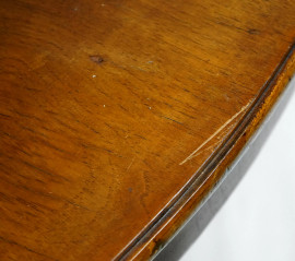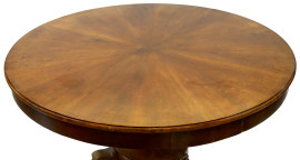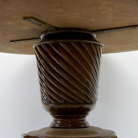 Tavolo circolare in noce, piano poggiante su grande gamba scolpita a torchon, base circolare con tre piedi mossi, cm h 77x141, (difetti)