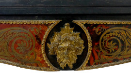 In legno ebanizzato e lastronato in tartaruga con inserti e profilatura in metallo dorato a ramages, piano di linea sagomata a libro, grembiale centrato da mascheroni, poggiante su quattro gambe mosse.